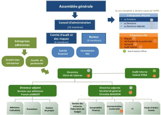 La direction générale est assurée par Claire de Lépinau accompagnée de Franck Lambert et Christèle Macron en tant que Directeurs adjoints en charge respectivement du service aux adhérents et du secrétariat général.